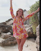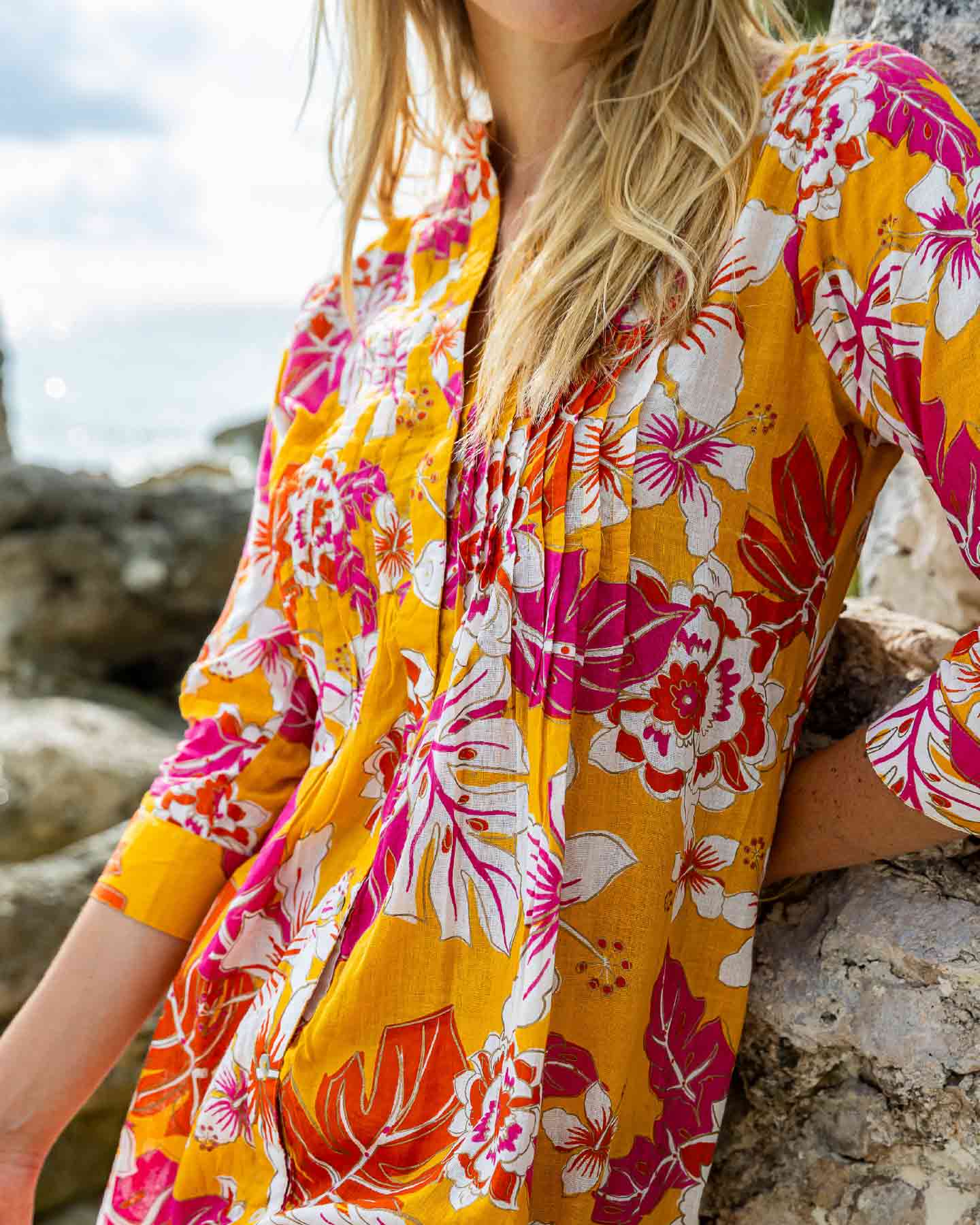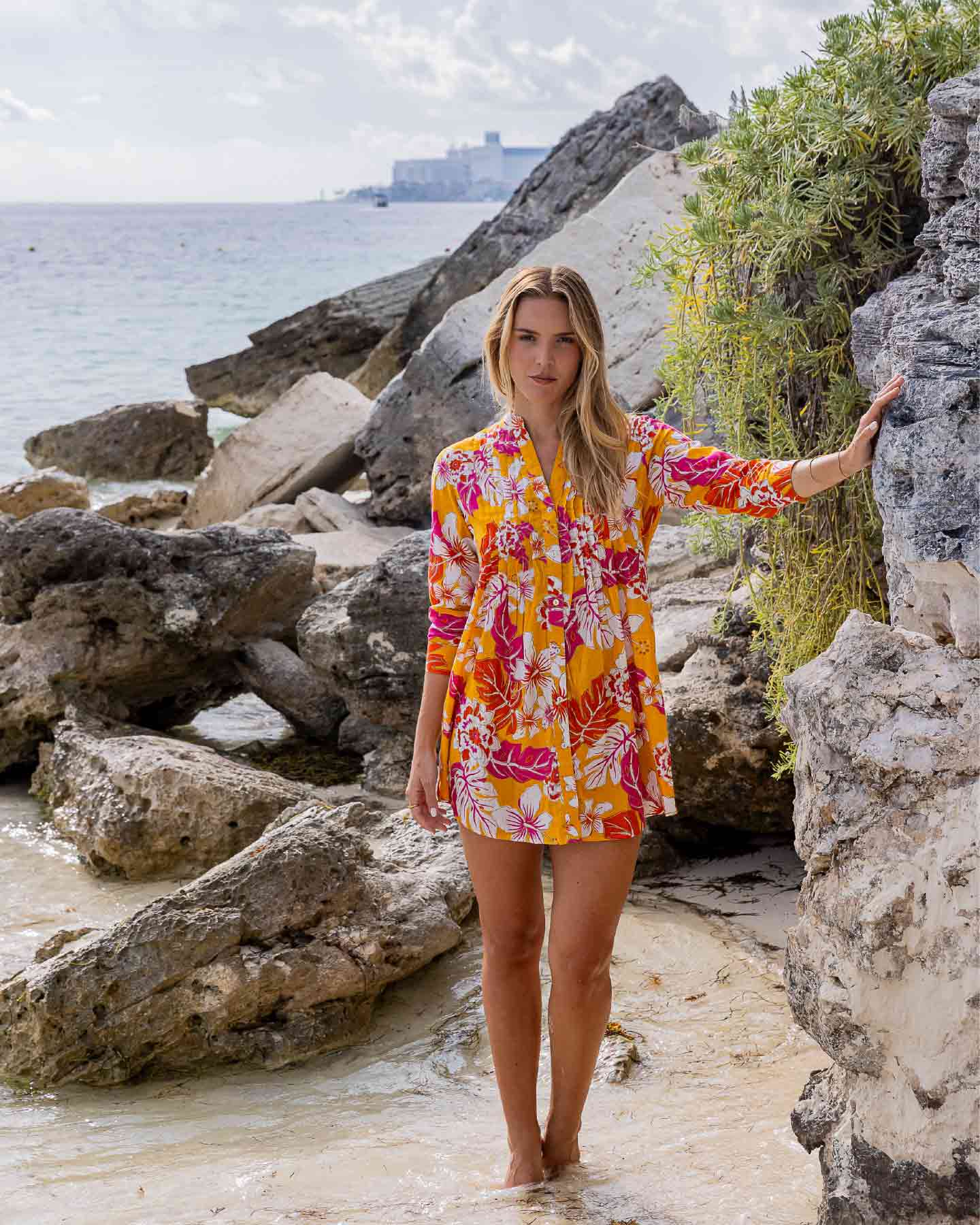 Inspirada en los jardines del trópico, sus tonos naranjas y fucsias evocan la vitalidad del verano, su tejido fresco es una invitación a vivir cada momento con libertad.