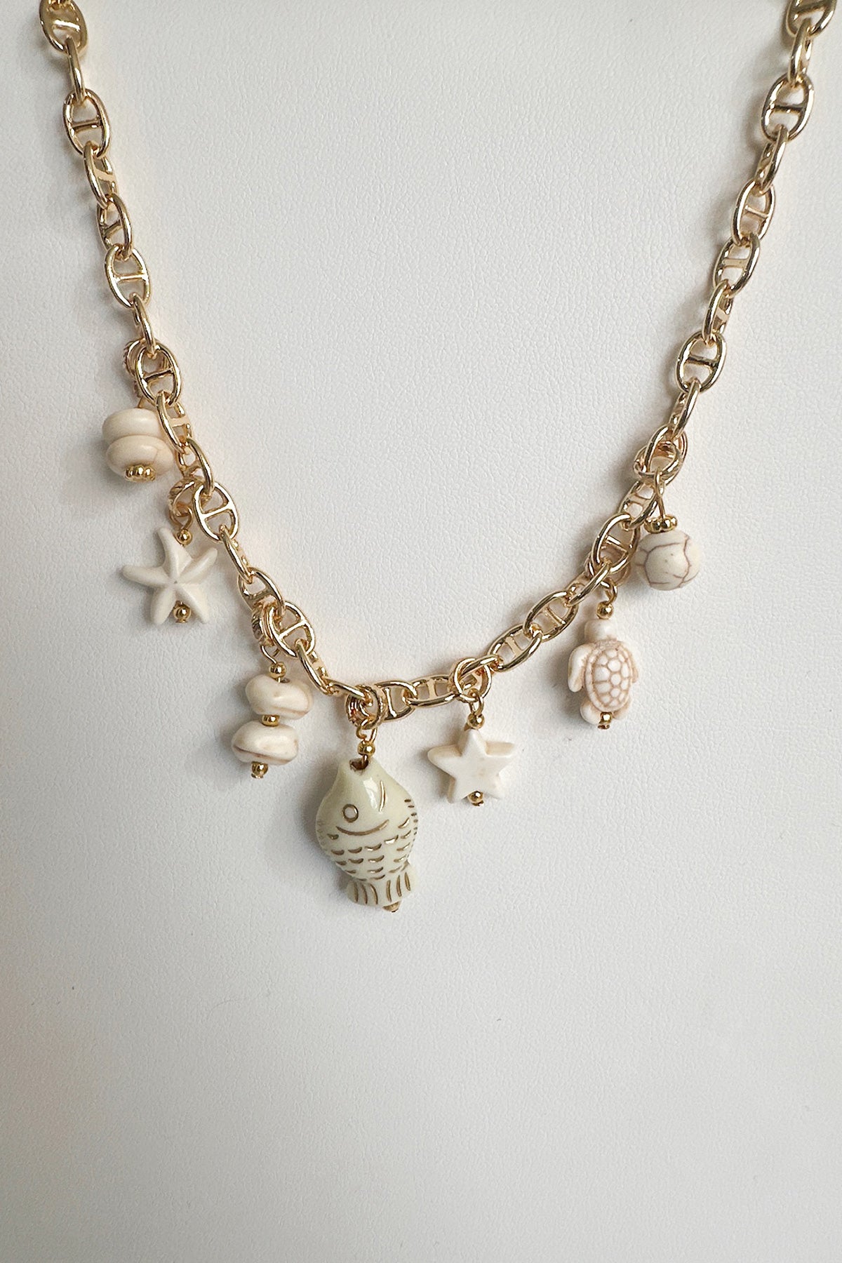Collar hecho piedras en ceramica y dije en con caracol y pesces